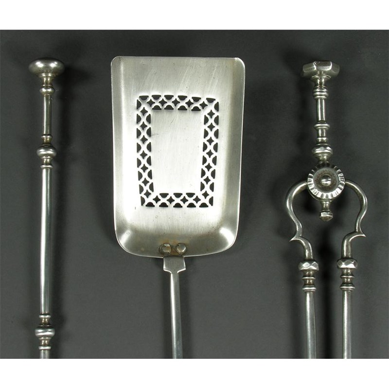 Three 19th century polished steel fire irons, the pierced shovel and poker with turned knops, the tongs with faceted knops. (3)
