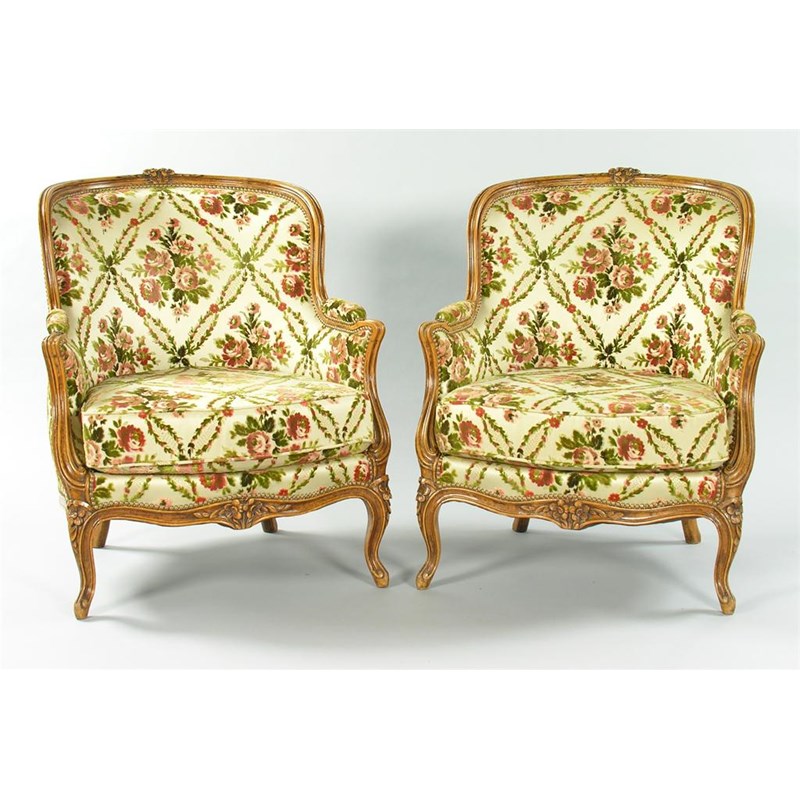 A pair of French carved and moulded show frame easy armchairs, the wrap around backs with a floral cresting to padded arms, serpentine front seats on cabriole legs. (2)