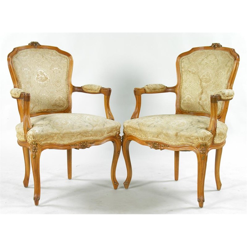 A pair of French floral carved and moulded walnut fauteuils, the padded cartouche shape backs to padded scroll open arms, the serpentine front seats on cabriole legs. (2)
