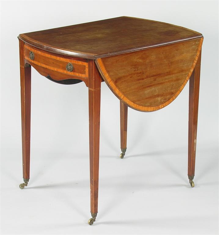 A 19th century mahogany Pembroke table, satinwood crossbanded and inlaid stringing, the oval top above a bowfront frieze drawer and shaped apron to a false reverse, fitted later handles, on square tapering legs to brass castors, 28.5in (72.4cm) h, 21in (53.4cm) w closed, 27.75in (70.5cm) d. Old restoration.