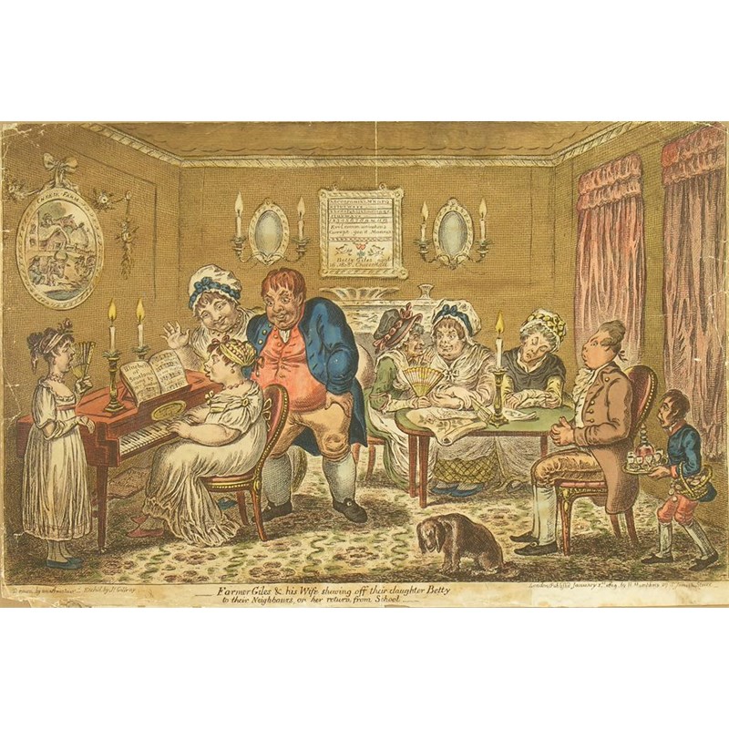 After James Gillray. 'Farmer Giles & his Wife shewing off their daughter Betty to their Neighbours, on her returen from School,' a coloured engraving, 12.5 x 18in (31.7 x 45.7cm) cut and with creases, and another caricature 'John Bull's first Visit to his Old Friend the New Secretary.' (2)