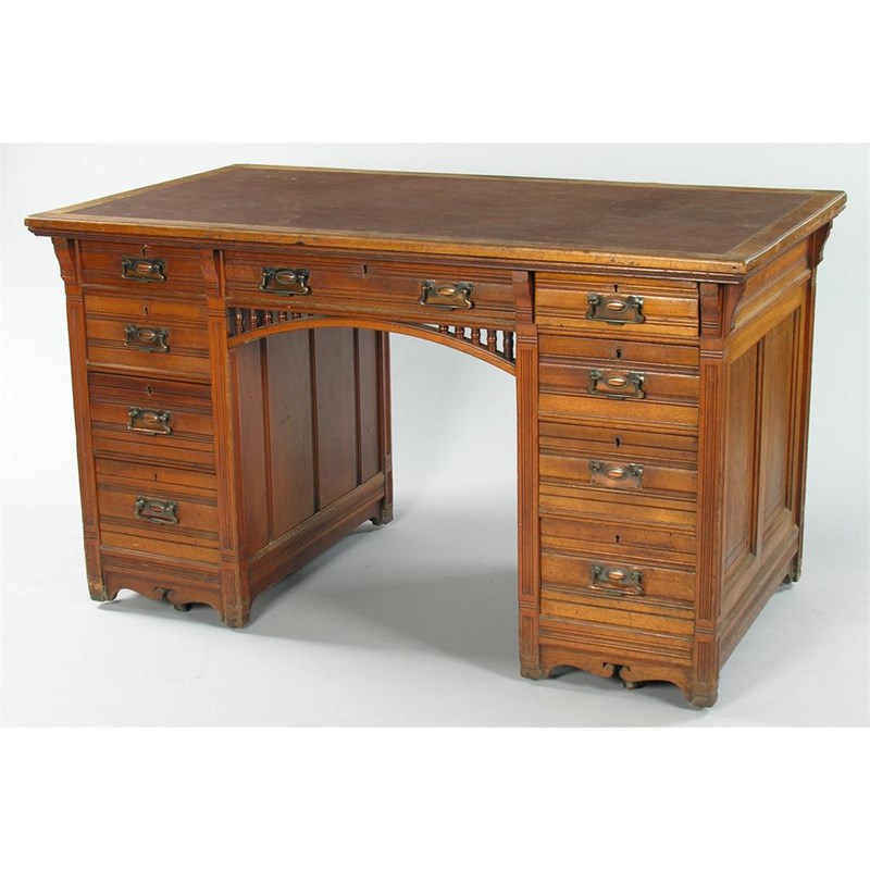 A late Victorian walnut pedestal desk by Gillow & Co, with reeded decoration, the later inset top above a central frieze drawer stamped 'Gillow & Co, L10198', above a balustraded arcade and flanked by four drawers each side fitted later handles on block feet and large castors, panelled sides and back, 31.75in (80.6cm) h, 54.5in (138.4cm) w, 30.25in (77cm) d.