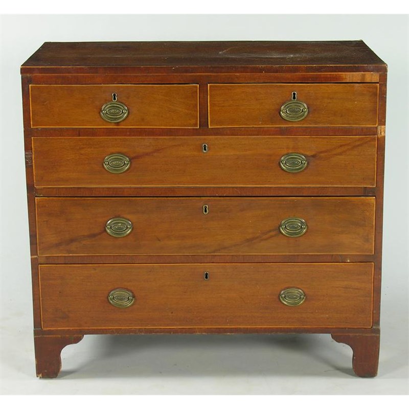 An early 19th century mahogany chest, the strung edge top above two short and three long drawers, sycamore beaded, fitted oval brass plate handles on bracket feet, 33.75in (85.6cm) h, 36.25in (92cm) w, 19in (48.2cm) d.