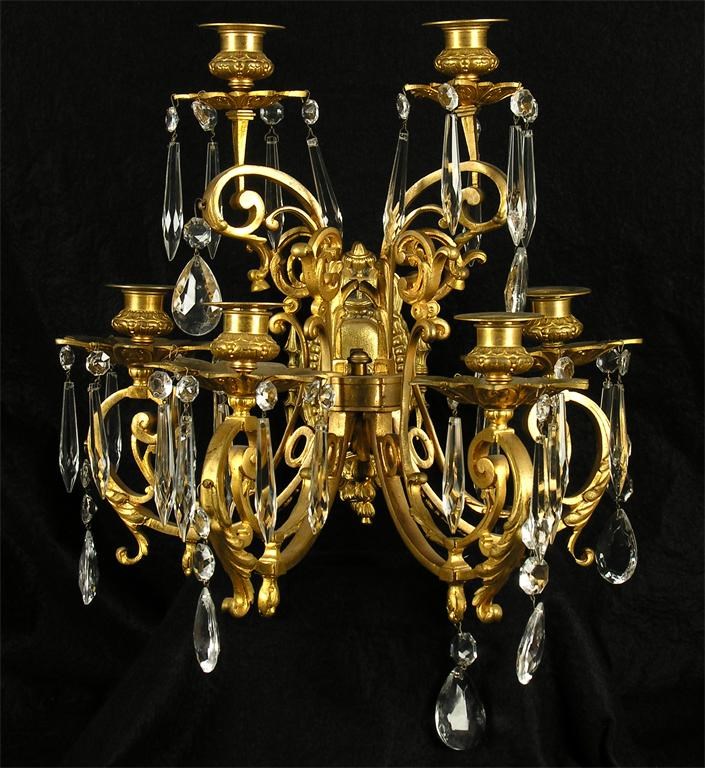 A pair of gilt brass and cut glass wall lights, the cabochon shaped plate with a scrolled arm to a central rondel issuing six scroll leafage branches, the drip pans hung with lustres, the drip pans and holders drilled, 14.75in (37.5cm) h, 15.5in (39.4cm) w, 12.5in (31.6cm) d. (2)