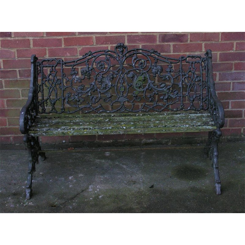A painted cast iron garden bench, with a slatted seat, 34in (86.3cm) h, 49.5in (125.6cm) w, 24in (61cm) d.