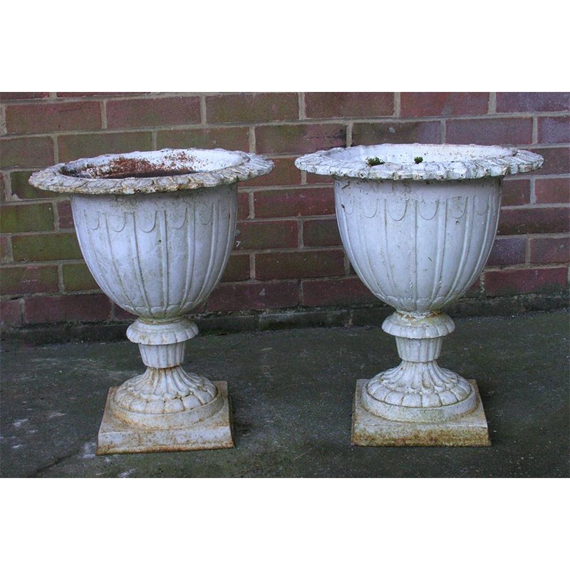 A pair of white painted cast iron garden urns, 19.5in (49.5cm) h, 17in (43cm) dia. (2)
