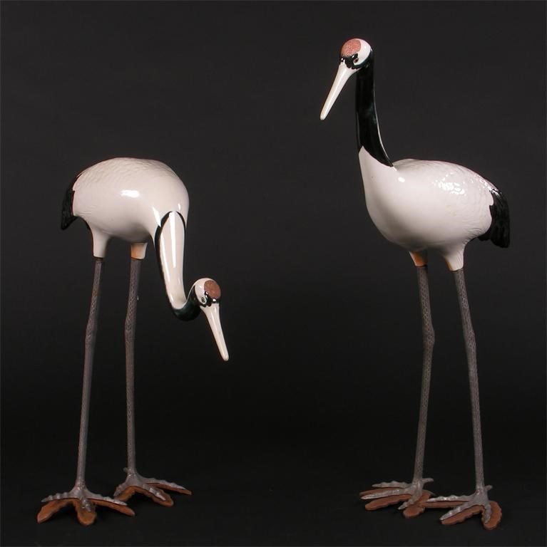 A pair of ceramic and iron models of cranes, the black and white bodies on detachable legs, 39in and 29.5in (99 and 75cm) h. (2)