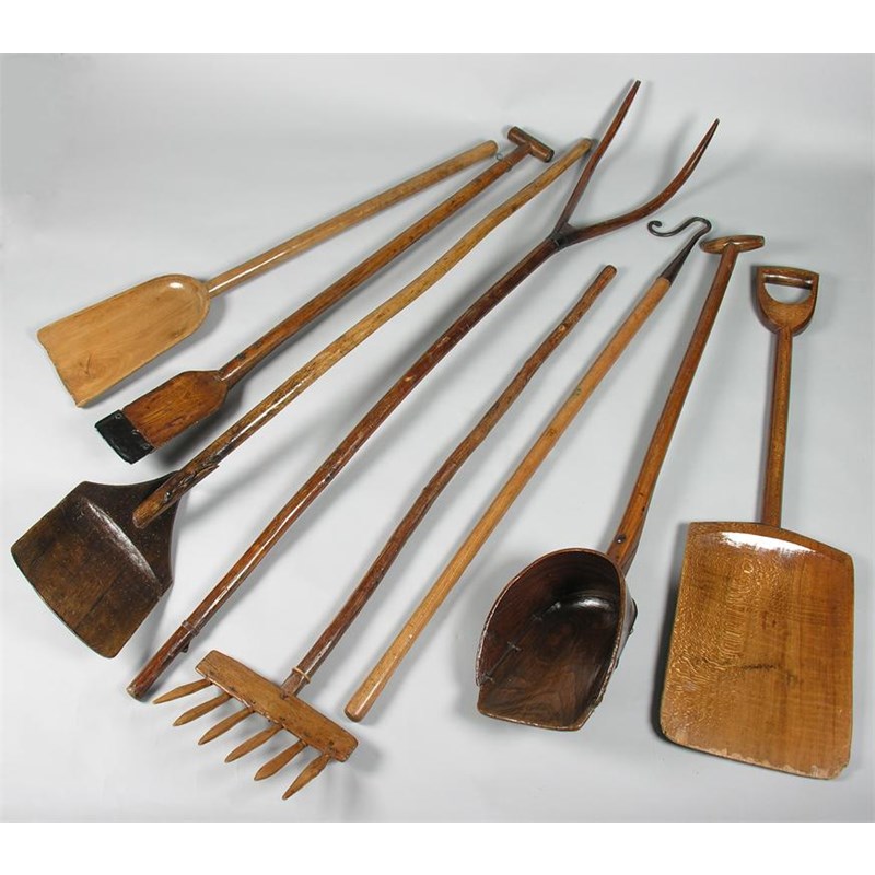 A beech malt shovel, 41in (104cm) l., a grain shovel, branded 'D.V.', a six prong rack, a hay fork branded 'Y.R.C.', a shovel with an angled handle, a mud scuppit, a fruitwood flat shovel and a shepherd's crook.