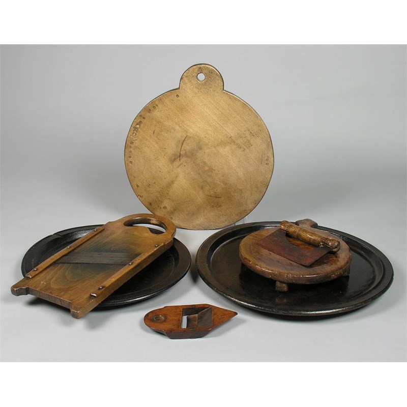 A sycamore platter, with a pierced handle, 15in (38cm) dia., a smaller platter with lug feet and a shaped handle, two vegetable slicers, a single handed chopper and two ebonised platters. (7)
