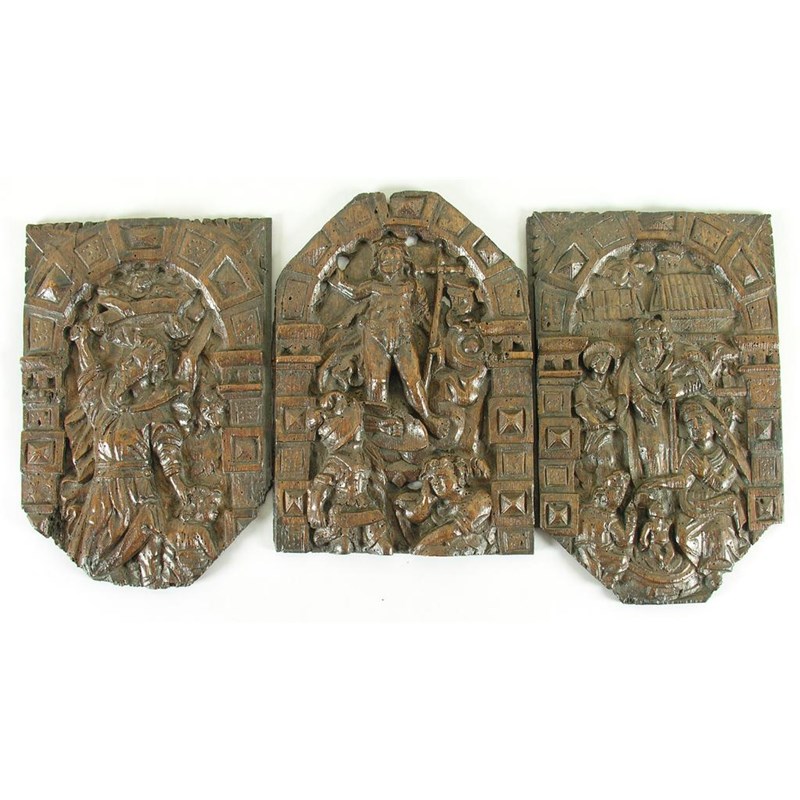 Three 17th century Dutch carved oak panels, depicting religious scenes within arches, two with canted corners to the base, the other to the top, 12.25 x 8in (31 x 20.3cm) largest. (3)