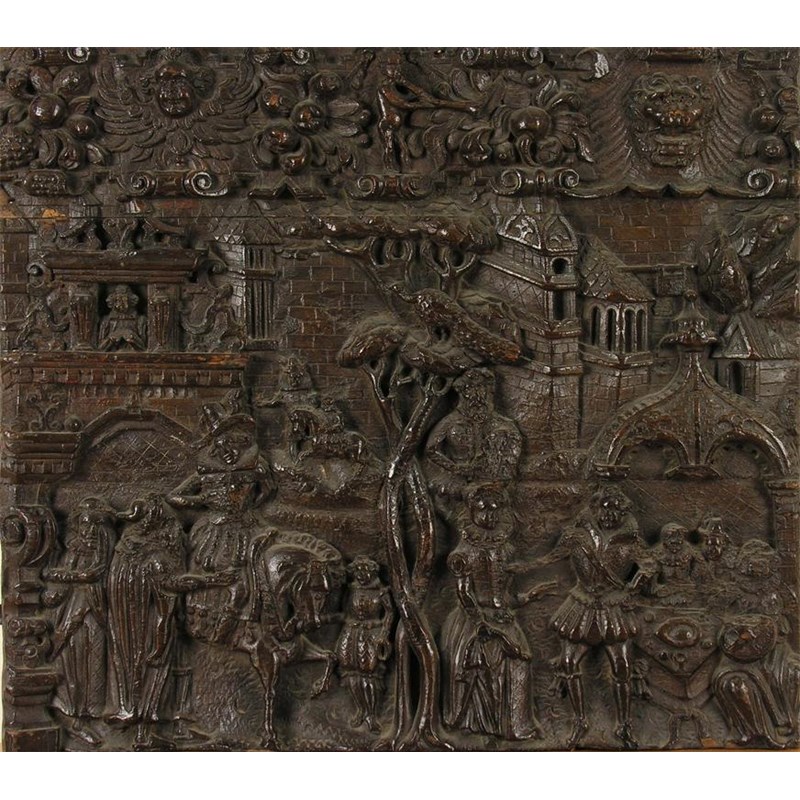 A late 16th century Flemish carved oak panel, decorated fruit, winged cherub head and a lion mask, above buildings and a tree with figures in period costume possibly attending a wedding, 23 x 25.5in (58.4 x 65cm).
