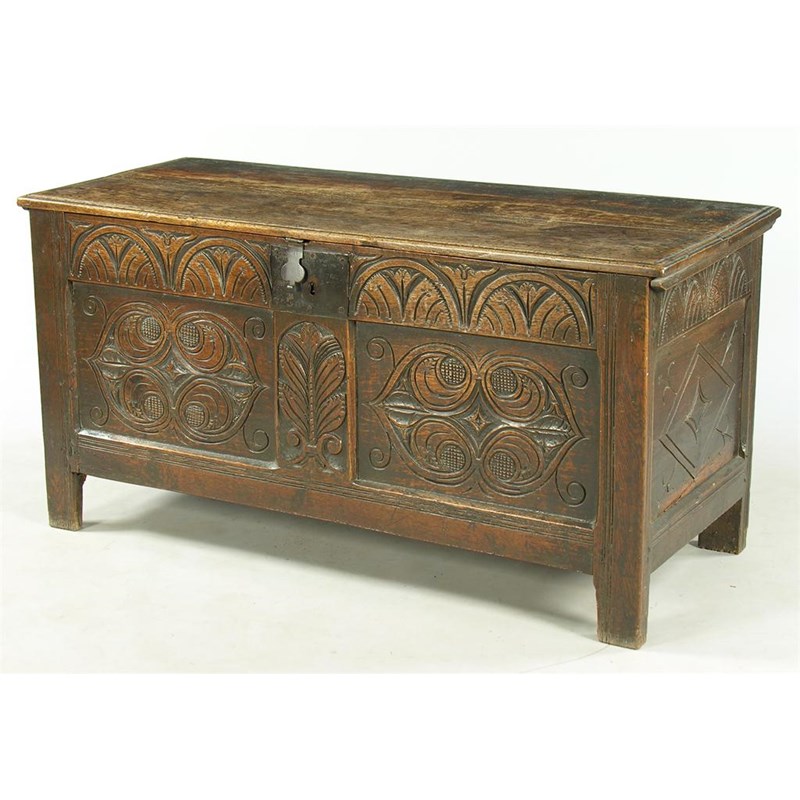 A late 17th century West Country panelled oak chest, the moulded edge top with traces of decoration to a till, cover missing, the lunette carved frieze above heart shape motifs, the sides carved lozenges, on moulded stile feet, 25in (63.5cm) h, 50.5in (128.2cm) w, 21in (53.3cm) d.