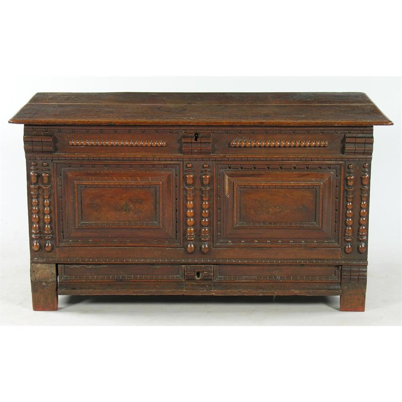 A panelled oak chest, the hinged boarded top to a lidded till, to a walnut panelled front with banding and turned split moulding, the base with a long drawer, the stile feet tipped, late 17th century and later, 25.5in (64.18cm) h, 47.25in (120cm) w, 22in (56cm) d.
