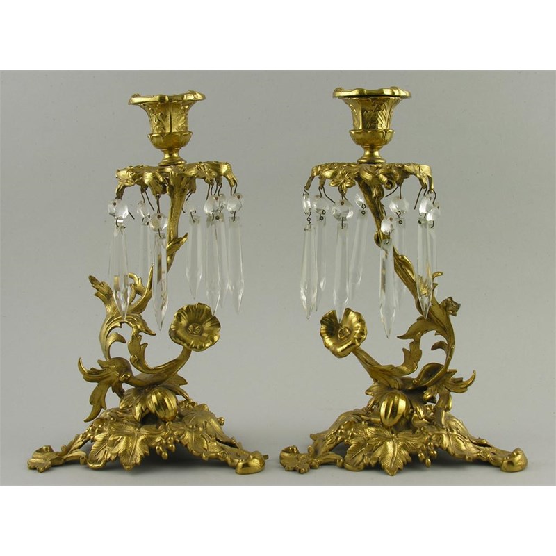 A pair of gilt brass candlesticks, the vine triform base to a convolvulus scroll stem and a pierced canopy hung with glass lustres, to leaf campana holders, 11in (28cm) h. (2)