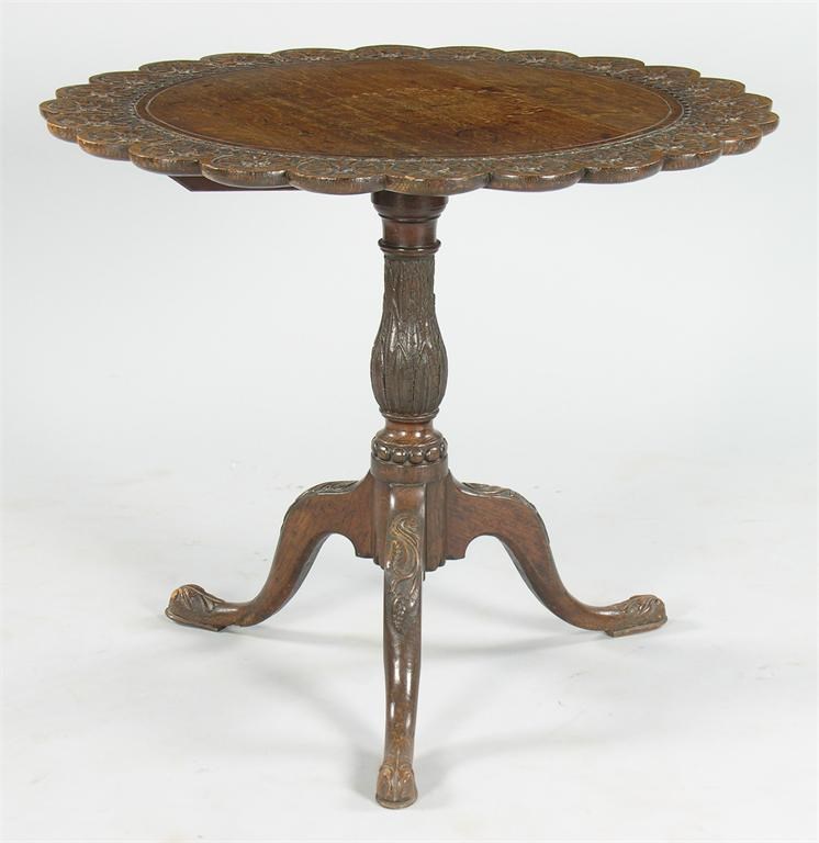 A 19th century carved oak tripod table, the scallop edge tilt-top with flower heads, on a stiff leaf baluster stem to cabriole legs, 28in (71cm) h, 33in (84cm) dia.