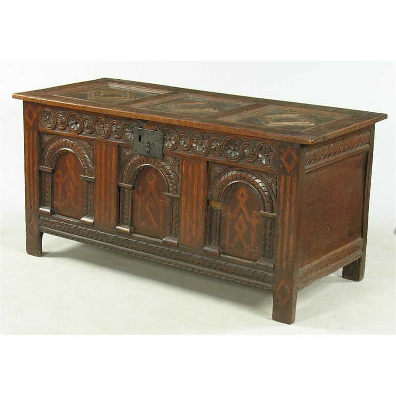A 17th century oak and parquetry inlaid chest, the hinged triple panel top with applied lozenges, above a floret carved guilloche frieze to arcaded carved panels inlaid geometric designs, flanked by faux fluted stiles, 24.25in (61.5cm) h, 49.5in (125.6cm) w, 21.25in (54cm) d.