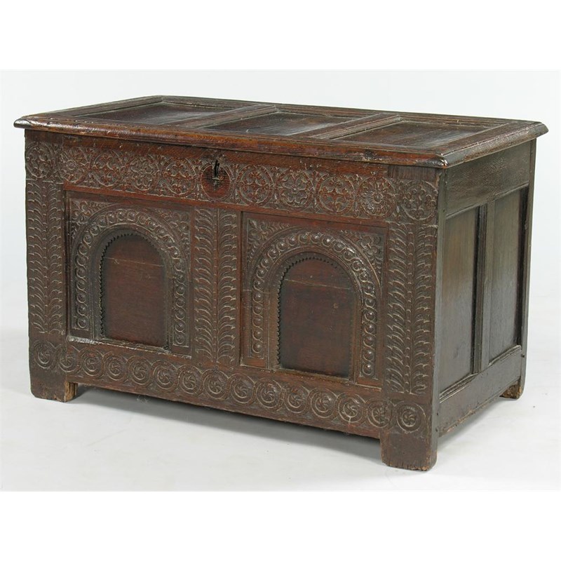 An early 18th century panelled oak chest, the triple panel hinged top with repaired corner above a carved frieze and twin panel arcaded front, stiff leaf carved stiles, 23.25in (59cm) h, 37.5in (95cm) w, 21.5in (54.5cm) d. Later hinges.