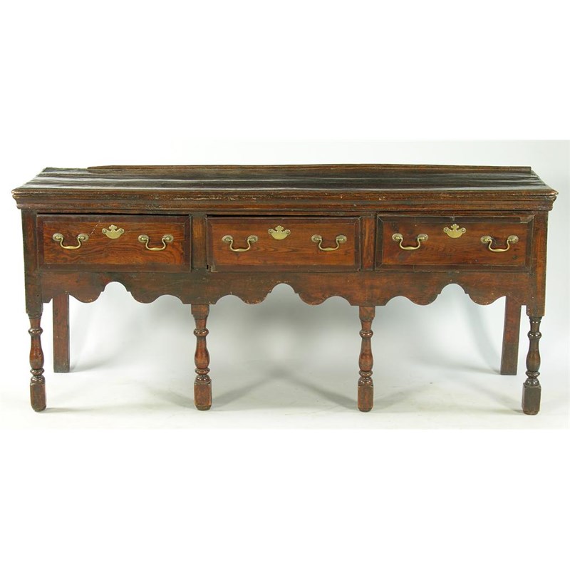An oak dresser, the boarded top with an applied back moulding above a moulded frieze, to three mahogany banded fitted brass handles, to a shaped apron, on turned baluster legs, 18th century and later, 30.25in (76.8cm) h, 68in (172.6cm) w, 20.5in (52cm) d.