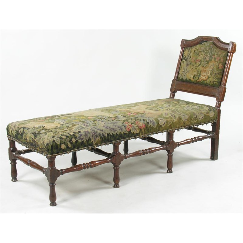 A late 17th century style turned oak day bed, the moulded arch top rail with a later needlework padded panel to a rectangular seat on turned and block supports with baluster stretchers, 39in (99cm) h, 67in (170.2cm) l, 23in (58.4cm) w.
