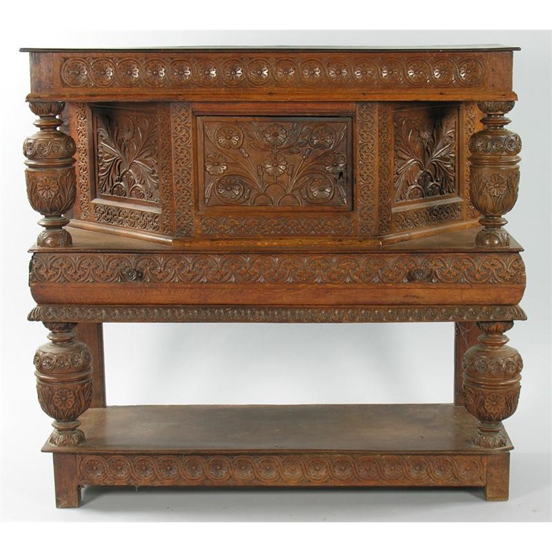 A carved oak livery cupboard, the guilloche and floret frieze above a door and faceted sides to cup and cover supports, above a drawer and a flared apron on larger cup and cover supports to a boarded undertier on stile feet, 48in (122cm) h, 49.5in (125.6cm) w, 17in (43cm) d.