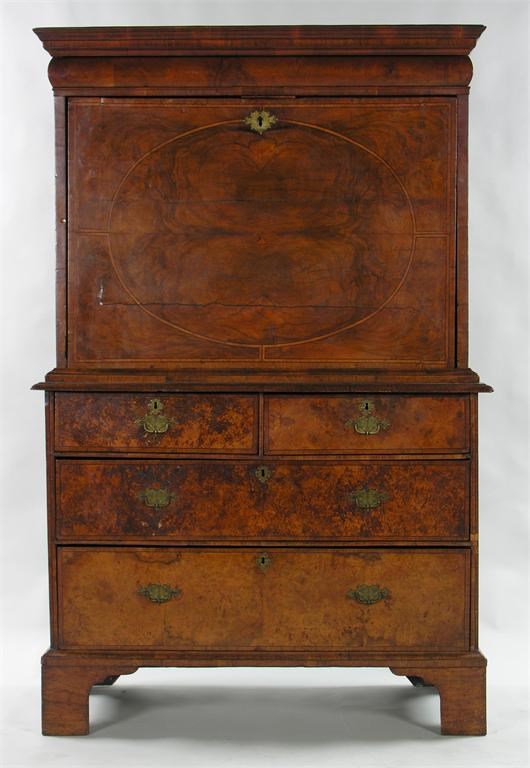A George I walnut escritoire, with crossbanding and stringing, the moulded cornice above a cushion frieze drawer to a fall fitted a later ratcheted leather lined slope and an arrangement of pigeon holes and drawers, including secret drawers and a cupboard door, the base with two short and two long drawers, fitted later engraved brass handles, on later bracket feet, 67in (170cm) h, 43.25in (110cm) w, 20.25in (51.4cm) d.