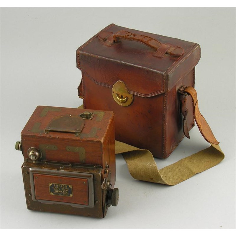 A Houghton-Butcher 'Ensign Focal Plane Tropical Model' camera, teak and brass mounted, in leather carrying case.
