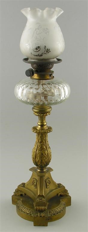 A 19th century gilt brass table oil lamp, the triform base with winged paw feet and masks, the leaf baluster stem to a cut glass reservoir, the burner stamped 'HINKS & SON'S PATENT,' with etched glass shade, 24.5in (62cm) h. Gilt worn.