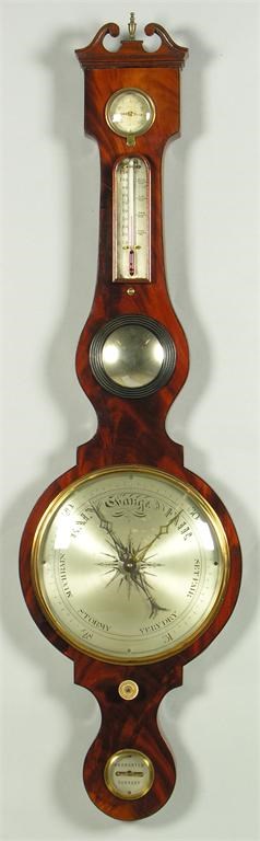 A Victorian mahogany banjo shape barometer, having silvered dials and a convex mirror, the main 10in. dial to a turned bone adjuster and a 'Warranted Correct' level, 43.5in (110.5cm) h.
