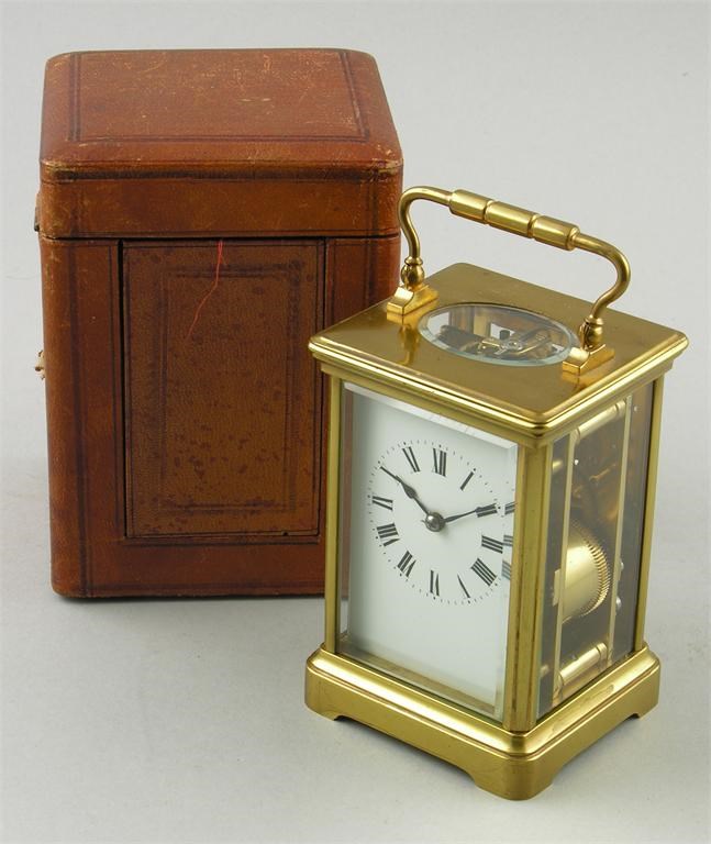 A French brass carriage clock, the platform lever escapement striking on a gong, stamped '9338', to a white enamel dial within a corniche case, 5.75in (14.5cm) h, in an associated leather travelling case.