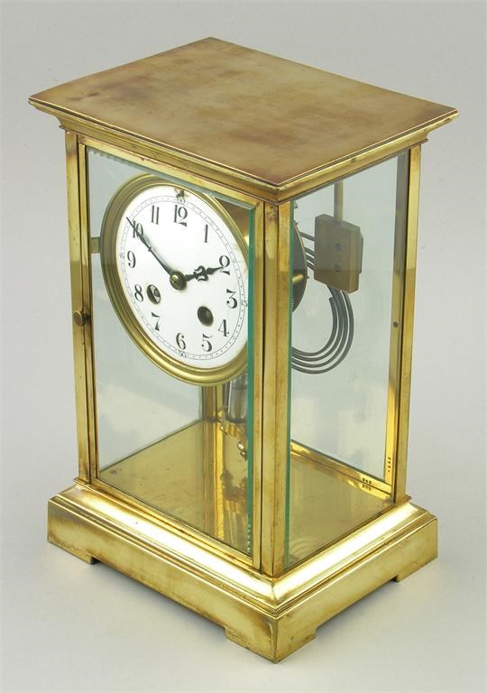 A French brass four glass mantel clock, the 8 day movement striking on a gong, mercury pendulum, the back plate stamped 'Couaillet Freres', to a circular enamel dial, cracked, the case with front and back doors, 10.75in (27.2cm) h.