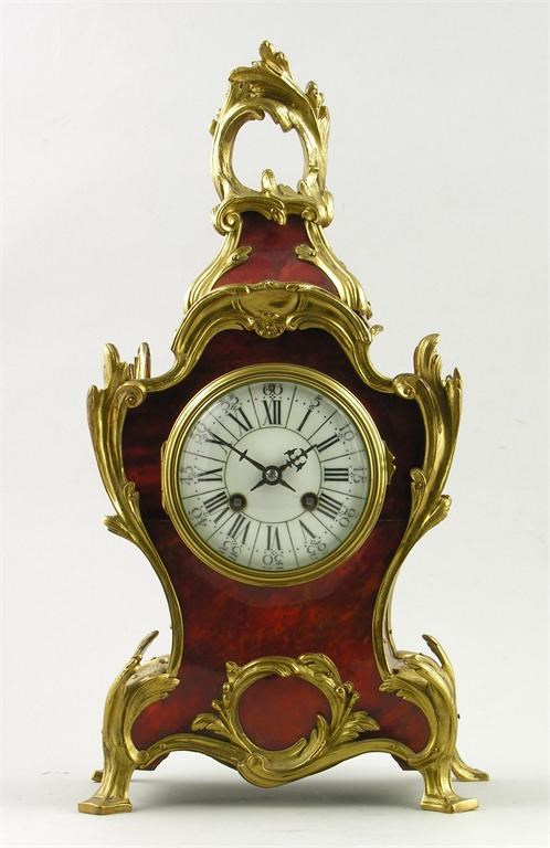 A late 19th century French tortoiseshell and gilt brass mounted mantel clock, the 8-day movement striking on a gong, the back plate stamped 'J Marti et Cie' and 'J.J.S' within an oblong, to a circular dial, within a cartouche shape case, 16.25in (41.2cm) h.