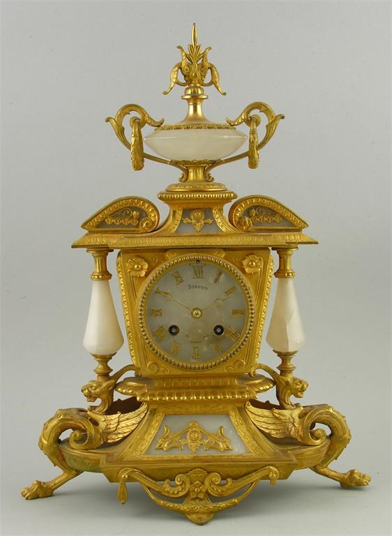 A late 19th century gilt spelter and alabaster mounted mantel clock, the 8 day movement stamped 'Japy Freres' and striking on a bell to a circular dial inscribed 'Bennett, 65 & 64 Cheapside, London,' within an ornate Grecian revival case, 16in (40.5cm) h.