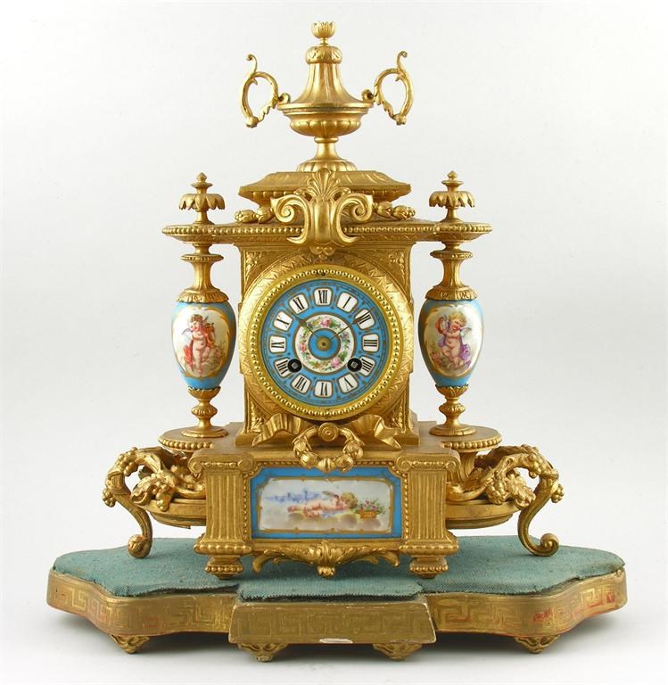 A late 19th century French gilt spelter and porcelain mounted mantel clock, the 8 day movement stamped 'Japy Freres,' and striking on a bell to a circular blue ground dial, floral painted, flanked by urns decorated cherubs, 14in (35.5cm) h.