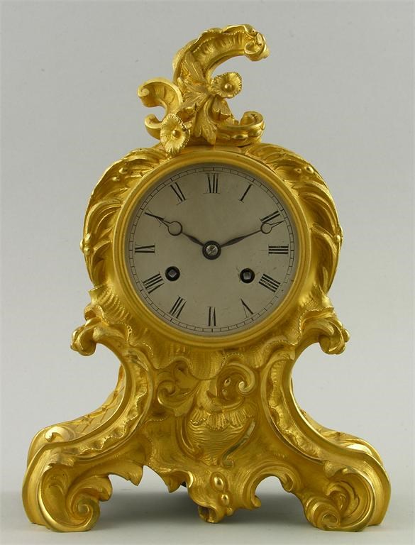 A 19th century French gilt brass mantel clock, the 8 day movement stamped 'Raingo Freres a Paris' and 'Douillon,' with an outside count wheel and striking on a bell, to a silvered dial, within a rococo style cartouche shape case, 10in (25.4cm) h, 7.5in (19cm) w.