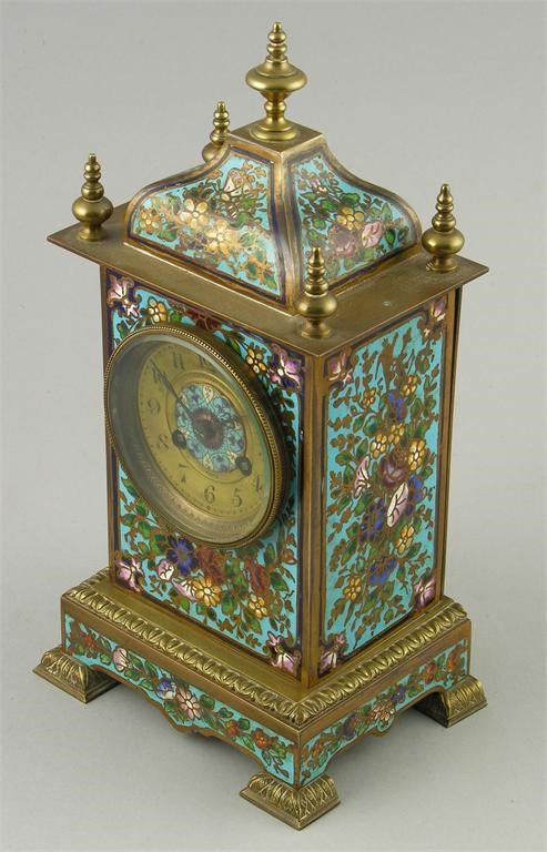 A French brass and champleve enamel mantel clock, the 8 day movement stamped 'Vincenti & Cie, 5899 37,' and striking on a gong to a circular dial with central boss, inscribed 'KALTENBACH, PARIS,' within a floral decorated case with turned urn finials, 11.5in (29cm) h, 6in (15cm) w, 4.5in (11.4cm) d.