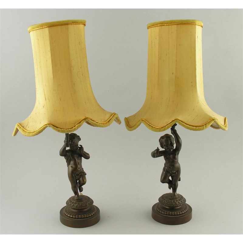 A pair of bronze putto table lamps, raised on circular leaf edge bases with registration lozenge, the figures standing on one leg and holding a torch with electric fitting, 10in (25.2cm) h. with shades. (2)