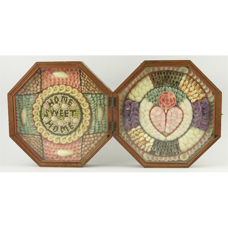 A sailor's shell valentine, of geometric designs with 'HOME SWEET HOME' and a heart motif, in a mahogany octagonal hinged and glazed case, 9in (23cm) w.