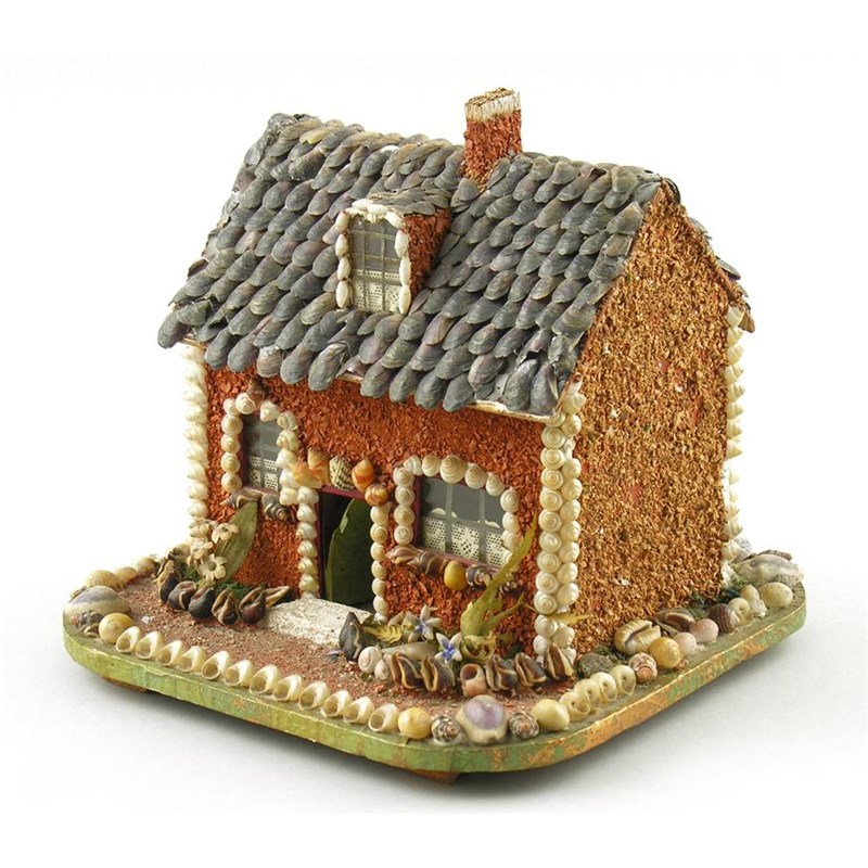 A shell model of a cottage, probably Jamaican, with additional cork and fabric decoration, on a wooden square base, 7in (17.8cm) h, 7.75in (19.6cm) w.