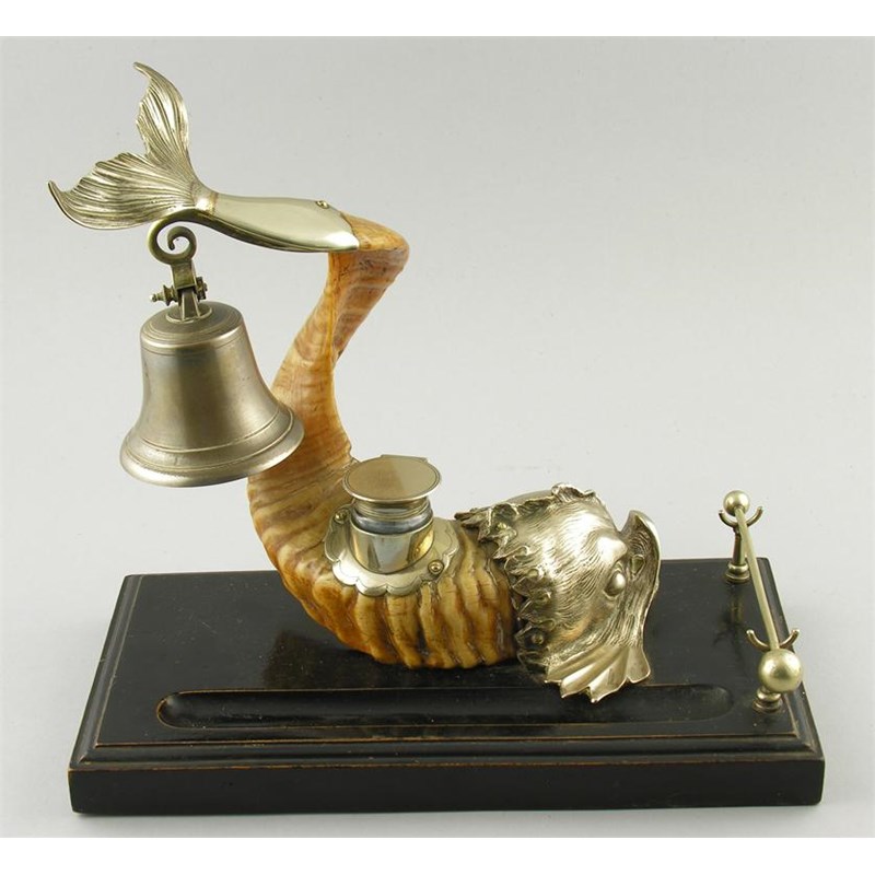 A late Victorian novelty inkstand, modelled as a dolphin, from a ram's horn and plated mounts, Rd No32842, (worn), having a glass inkwell and a bell, the ebonised base with a beater, 11.75in (30cm) h, 13in (33cm) w, 6.75in (17cm) d.