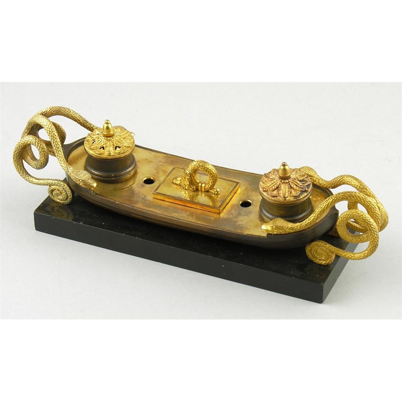 A 19th century bronze and ormolu boat shape inkstand, on a rectangular polished slate base to a central lidded compartment and a pair of wells, with later glass liners, to leaf and acorn covers, the ends with twin serpent supports, 3in (7.6cm) h, 11in (28cm) w, 3.25in (8.2cm) d.