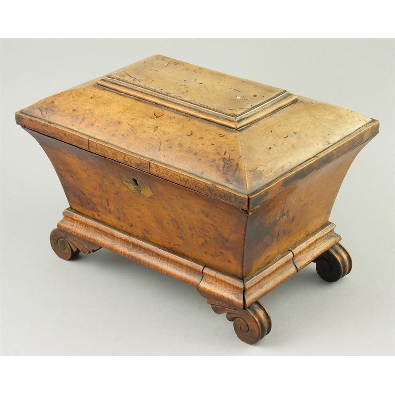 A William IV pollarded oak sarcophagus shape tea caddy, the hinged cover to a pair of hinged lid canisters, on carved scroll feet, 8in (20.3cm) h, 11.25in (28.5cm) w, 8in (20.3cm) d. Top and back faded.