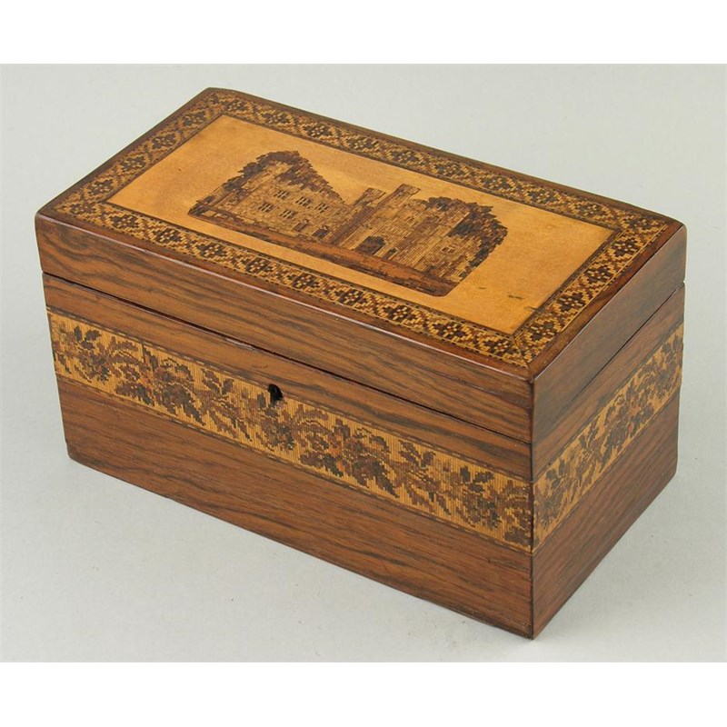 A Victorian Tunbridge ware tea caddy, the hinged cover decorated a castle, to a pair of lids, the body with a floral band, 4.75in (12cm) h, 8.5in (21.5cm) w, 4.5in (11.5cm) d.
