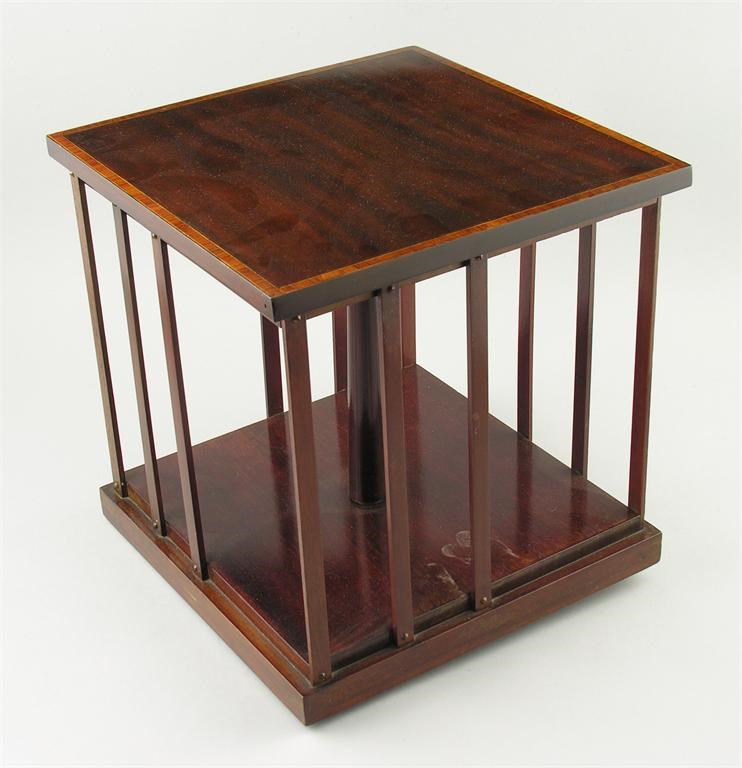 An Edwardian mahogany miniature revolving bookcase, the top kingwood banded and inlaid stringing, 11.25in (28.5cm) h, 11in (28cm) square.