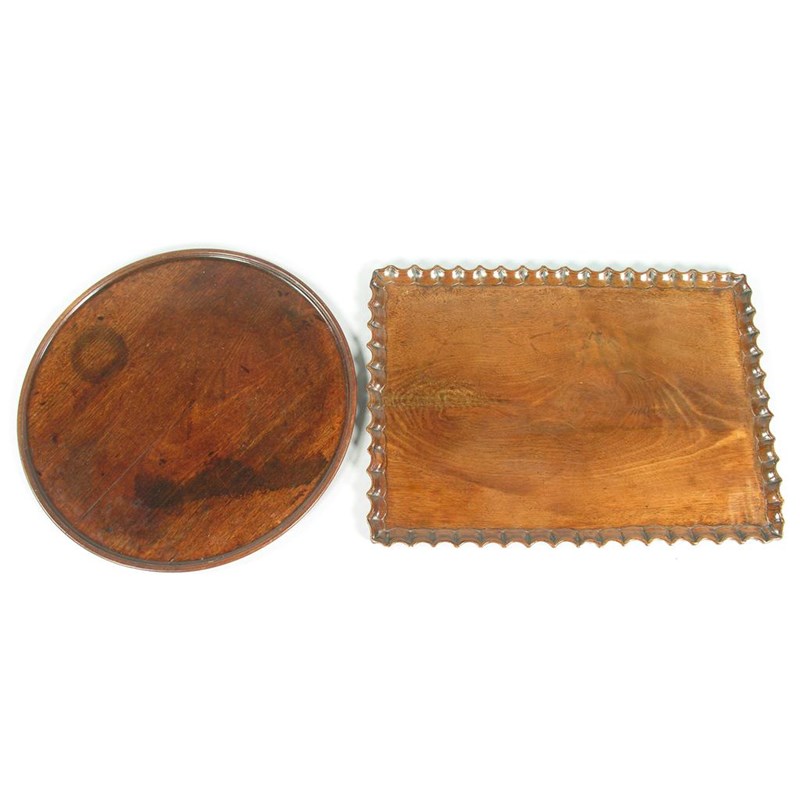 A mahogany circular dish top tray, 20in (50.8cm) dia. formerly a George III table top, and a rectangular mahogany tray with a raised scallop border, 23.75 x 17.25in (60.3 x 43.8cm.) (2)