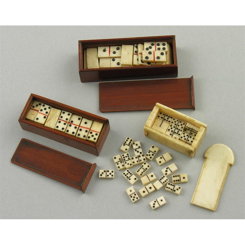 Miniature bone dominoes, (92) contained in two mahogany and one bone box, all with sliding covers, 1.5 -2.5in (4 - 6.4cm) long. (3)