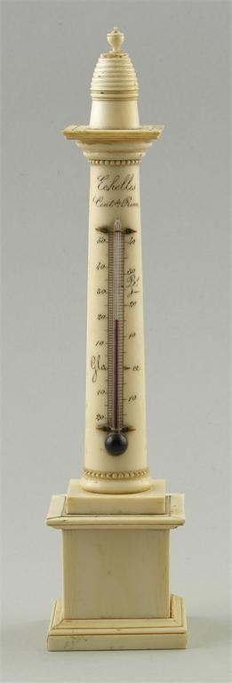 A French turned ivory column thermometer, inscribed 'Echelles, Cent de Reau', the back of the column is fluted, 9in (23cm) h.