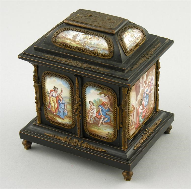 A Viennese enamel miniature table cabinet, with gilt brass mounts to the ebonised wood carcass, the domed top with landscape panels, above classical scenes and a pair of doors to two drawers, on turned feet, 4.75in (12cm) h, 4.25in (10.8cm) w, 3.5in (9cm) d. Cracks to the top drawer.