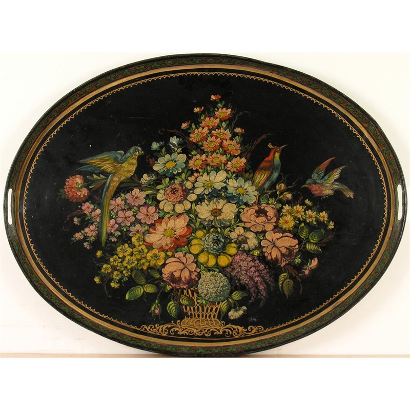 A large painted tle oval tray, still life of flowers in a basket with birds, the gallery with pierced hand grips, 32in (81.2cm) w.