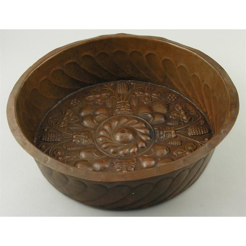 A continental circular embossed copper deep pan, centred a radiating boss to lion masks issuing fruiting vines, to swirl ribbed sides, 14.5in (37cm) dia.