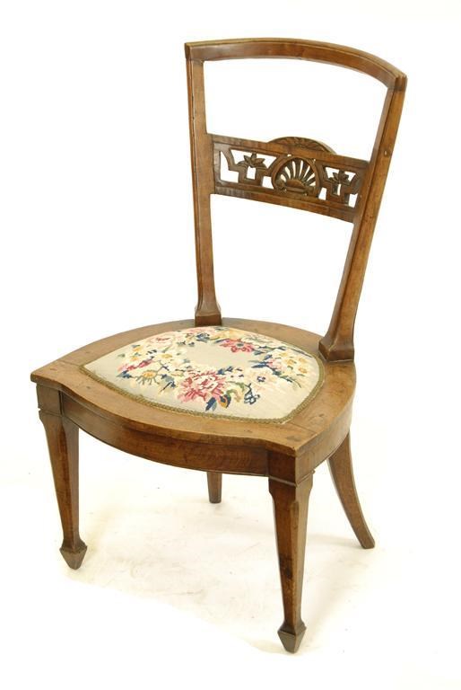 A 19th century Italian walnut side chair, the pierced rail back to a needlework seat, previously caned.